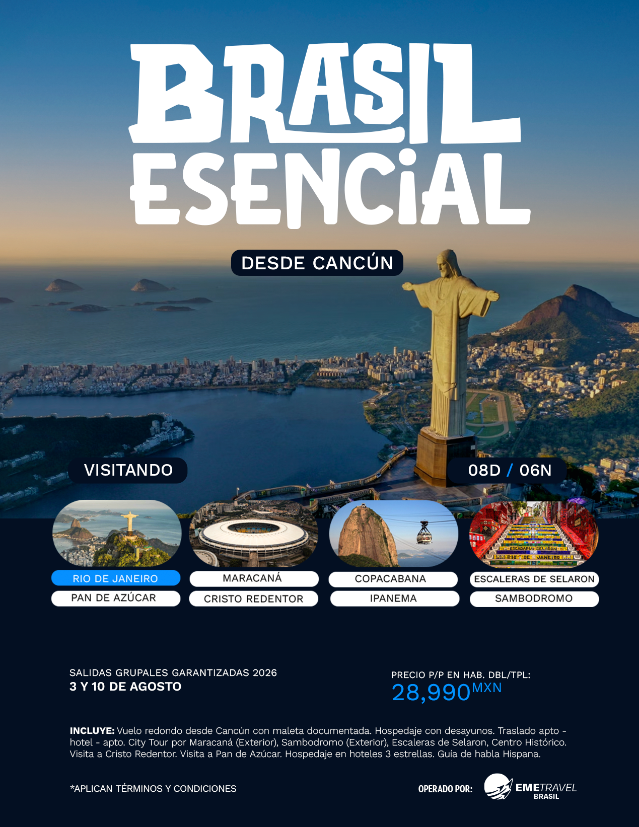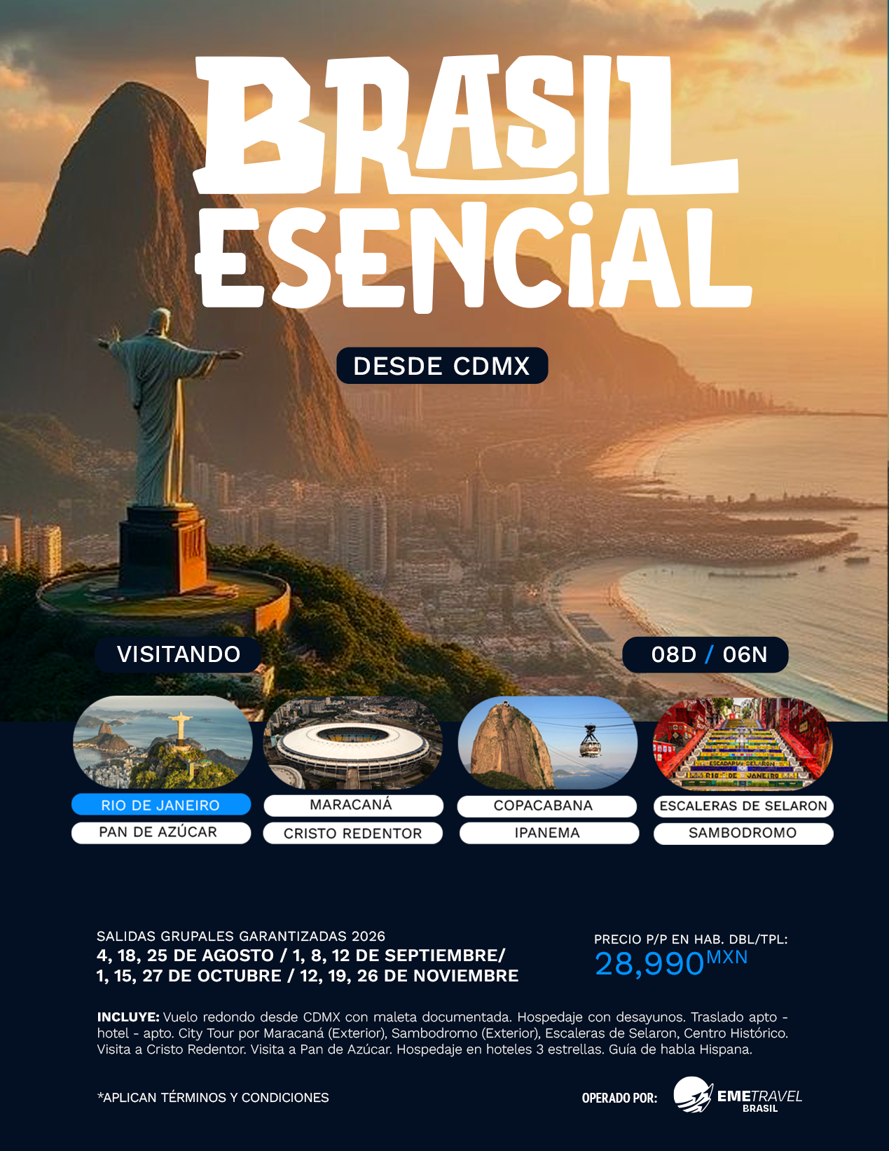 Este inolvidable viaje te invita a descubrir la esencia de Brasil a través de su ciudad más emblemática: Río de Janeiro, un destino vibrante donde la naturaleza, la historia y la cultura se fusionan en cada rincón. La experiencia comienza con la llegada a Río, donde podrás recorrer su fascinante Centro Histórico, admirar el colorido exterior del Sambódromo, el imponente exterior del Estadio Maracaná y las icónicas Escaleras de Selarón. Durante el viaje, vivirás momentos únicos al ascender al majestuoso Cristo Redentor, una de las Siete Maravillas del Mundo Moderno, desde donde se obtienen impresionantes vistas panorámicas de la ciudad. También disfrutarás del emblemático Pan de Azúcar, al que se accede en teleférico, ofreciendo una vista espectacular de la bahía de Guanabara. A lo largo de los días, tendrás tiempo para relajarte, explorar a tu ritmo y sumergirte en el alegre ambiente carioca, rodeado de playas, montañas y paisajes inolvidables.
