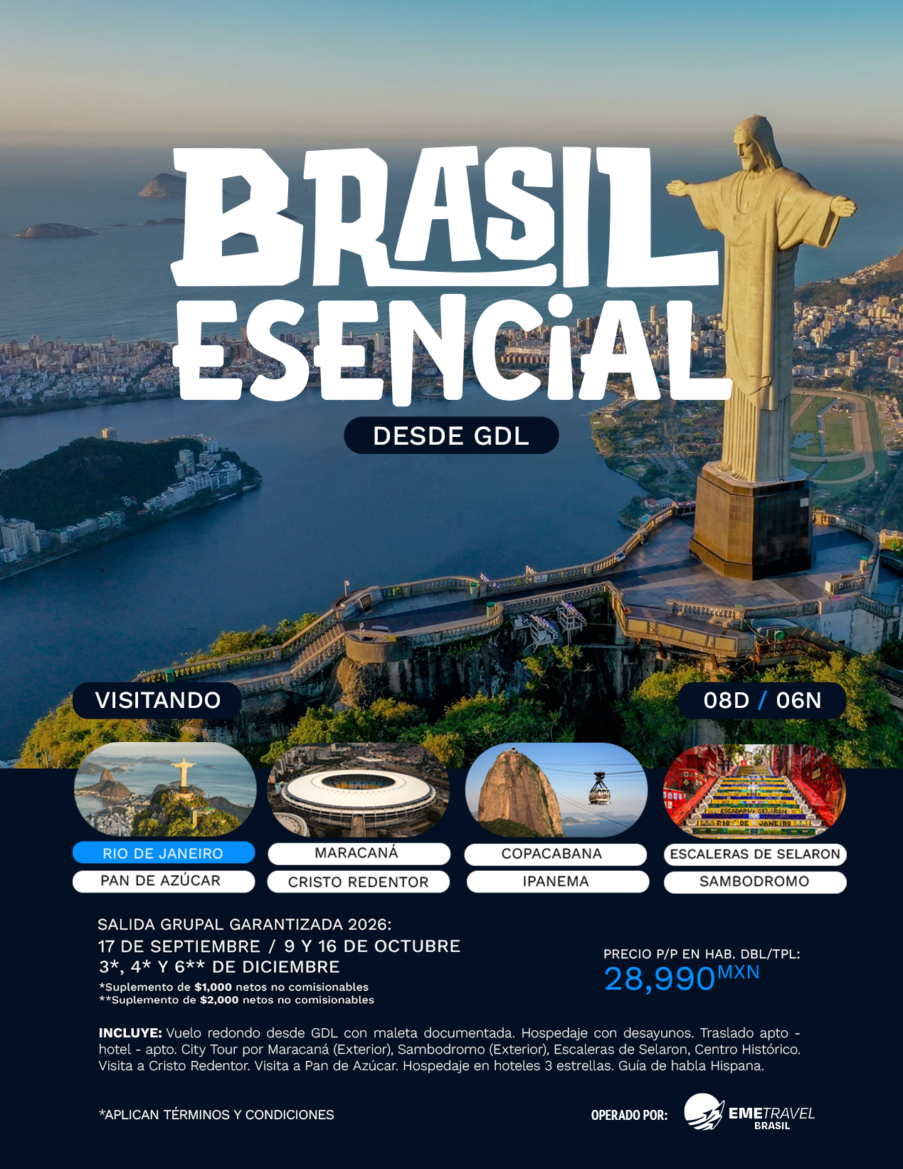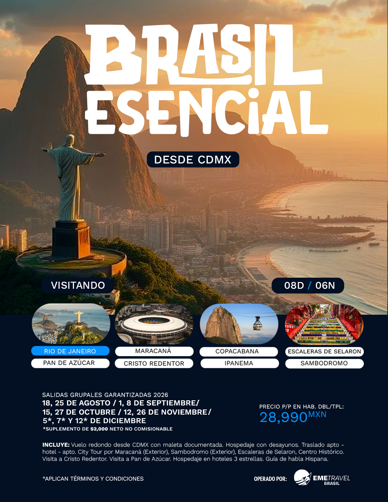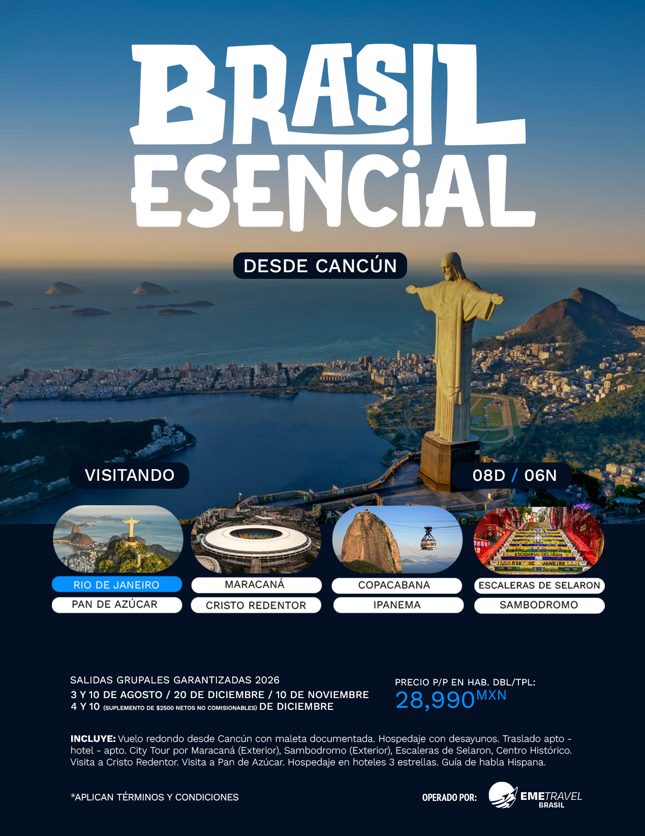 DESDE CANCÚN: AGO: 3 Y 10 / DIC: 4 Y 20 (suplemento de $2500 netos no comisionables)