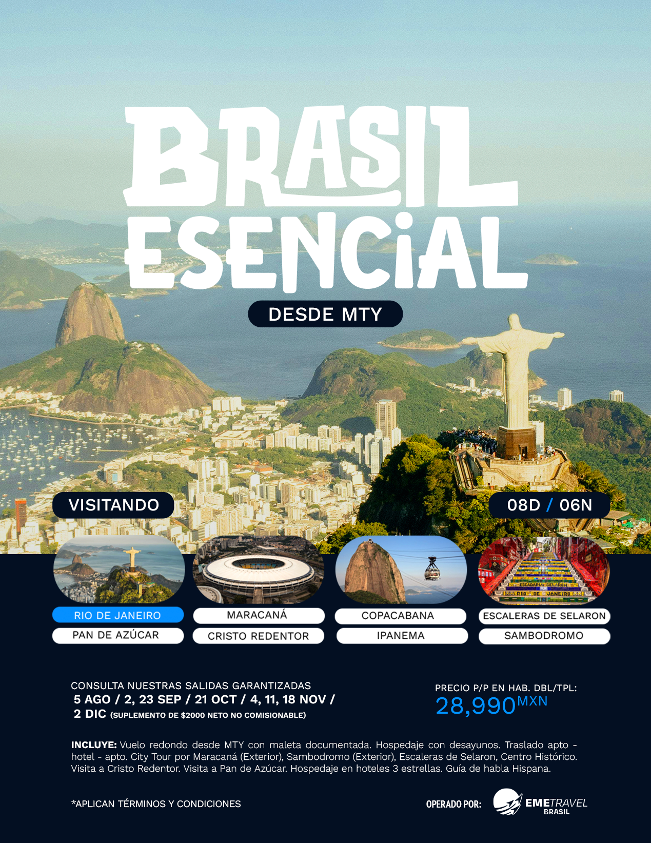 DESDE MTY: AGO: 5 / SEP: 2, 23 / OCT: 7, 21 / NOV: 4, 11, 18 /DIC: 2 (SUPLEMENTO DE $2000 NETO NO COMISIONABLE)