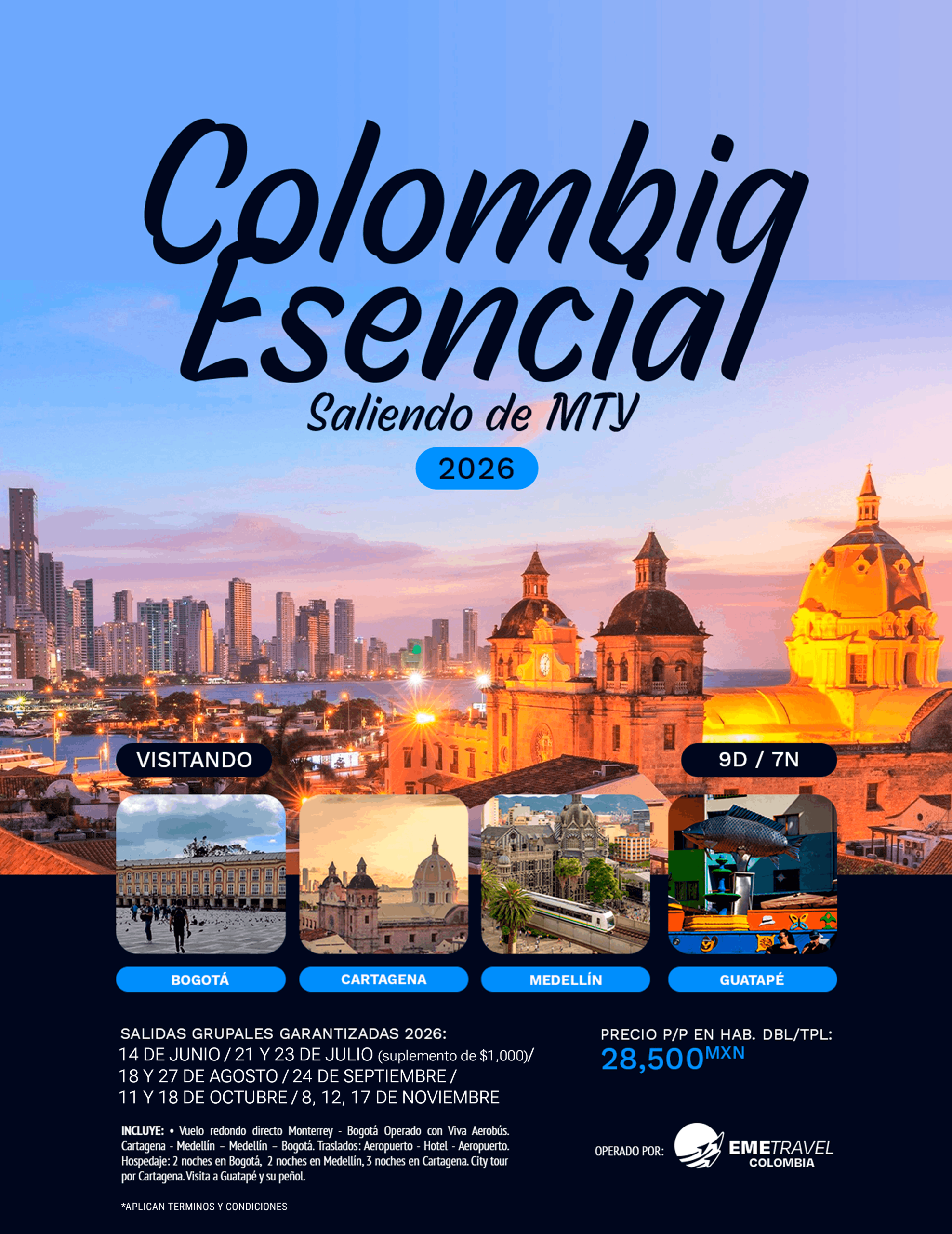 La aventura sigue en Medellín, donde te maravillarás con los coloridos paisajes de Guatapé y su famoso Peñol. También tendrás la opción de explorar la historia de Pablo Escobar o sumergirte en la cultura cafetera de San Sebastián de Palmitas. Cada destino ofrece una mezcla perfecta de cultura, historia y naturaleza, haciendo de este viaje una experiencia inolvidable. El recorrido termina en Bogotá, donde tomarás el vuelo de regreso a la Ciudad de México, llevando contigo recuerdos imborrables de la riqueza cultural y paisajes deslumbrantes de Colombia.