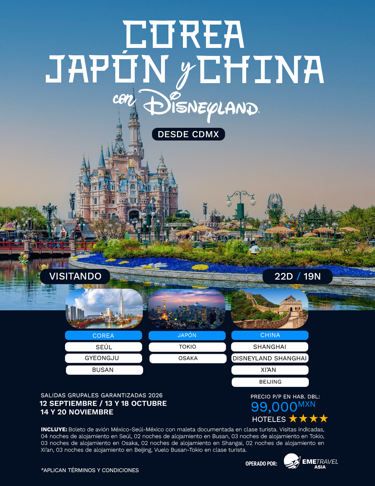 Desde la energía cosmopolita de Seúl y Tokio, hasta la riqueza histórica de Xi’an y Beijing, cada destino revela templos ancestrales, palacios imperiales y tradiciones vivas. La experiencia se completa en la moderna Shanghai, donde disfrutarás un día inolvidable en Shanghai Disneyland, fusionando la magia de Disney con la cultura china.