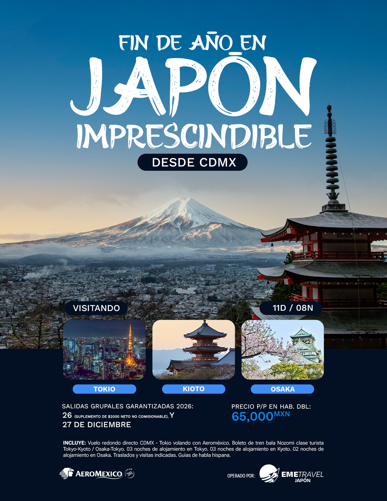 DESDE CDMX: 26 (SUPLEMENTO DE $2000 NETO NO COMISIONABLE), y 27 DE DICIEMBRE