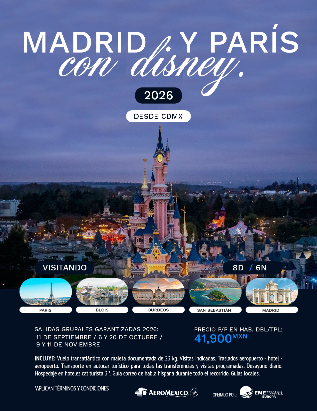 Un viaje que une dos capitales llenas de encanto: París, con sus avenidas icónicas, la Torre Eiffel, el Sena y la posibilidad de visitar Versalles, y Madrid, vibrante entre la Gran Vía, la Plaza Mayor y el legado histórico del Madrid de los Austrias. En medio, un día completo en Disneyland París, donde desfiles, castillos y atracciones crean una experiencia mágica para todas las edades. Paradas en Blois y Burdeos, entre castillos y plazas iluminadas, para cerrar con un recorrido equilibrado entre cultura, historia y fantasía.