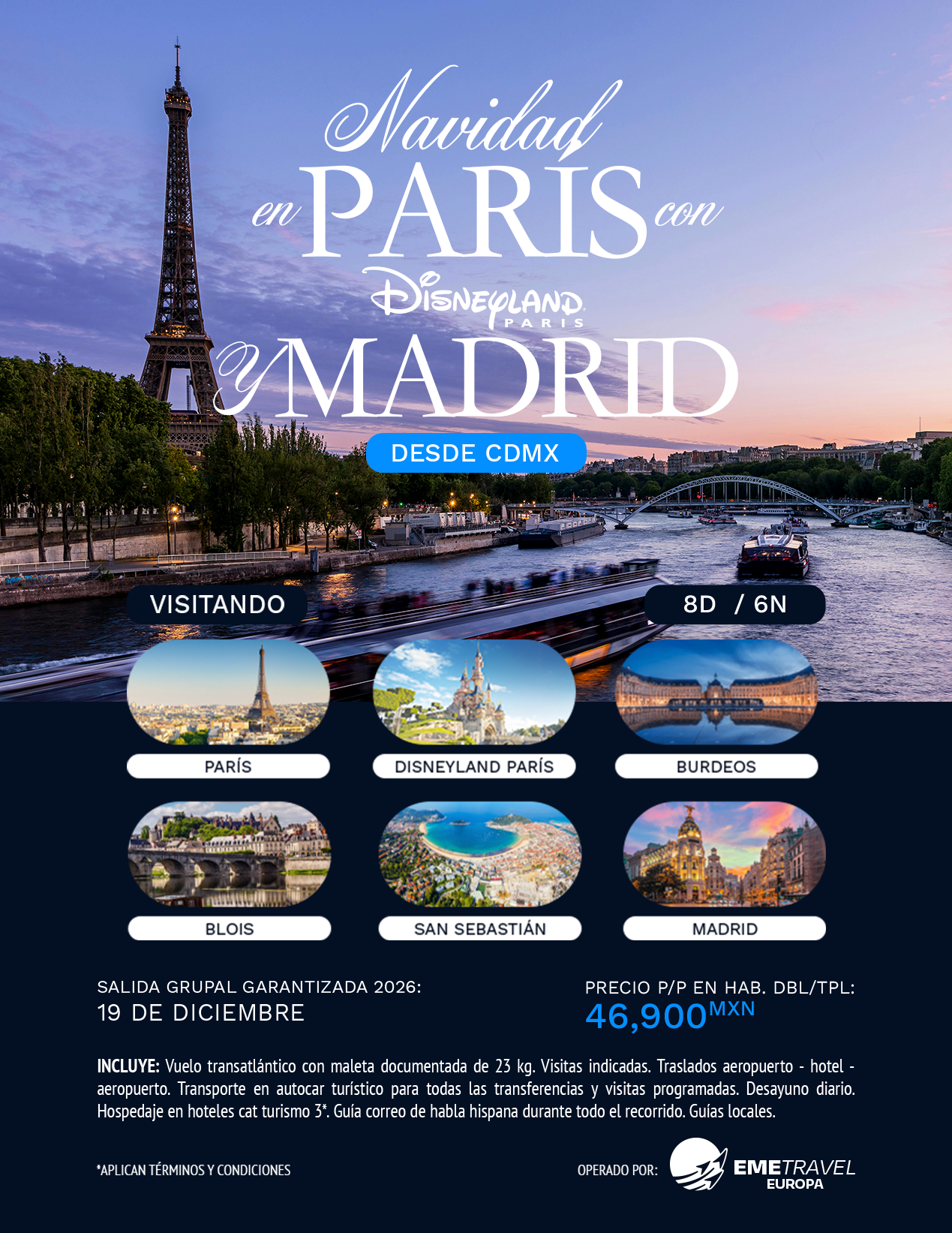 Un viaje que une dos capitales llenas de encanto: París, con sus avenidas icónicas, la Torre Eiffel, el Sena y la posibilidad de visitar Versalles, y Madrid, vibrante entre la Gran Vía, la Plaza Mayor y el legado histórico del Madrid de los Austrias. En medio, un día completo en Disneyland París, donde desfiles, castillos y atracciones crean una experiencia mágica para todas las edades. Paradas en Blois y Burdeos, entre castillos y plazas iluminadas, para cerrar con un recorrido equilibrado entre cultura, historia y fantasía.