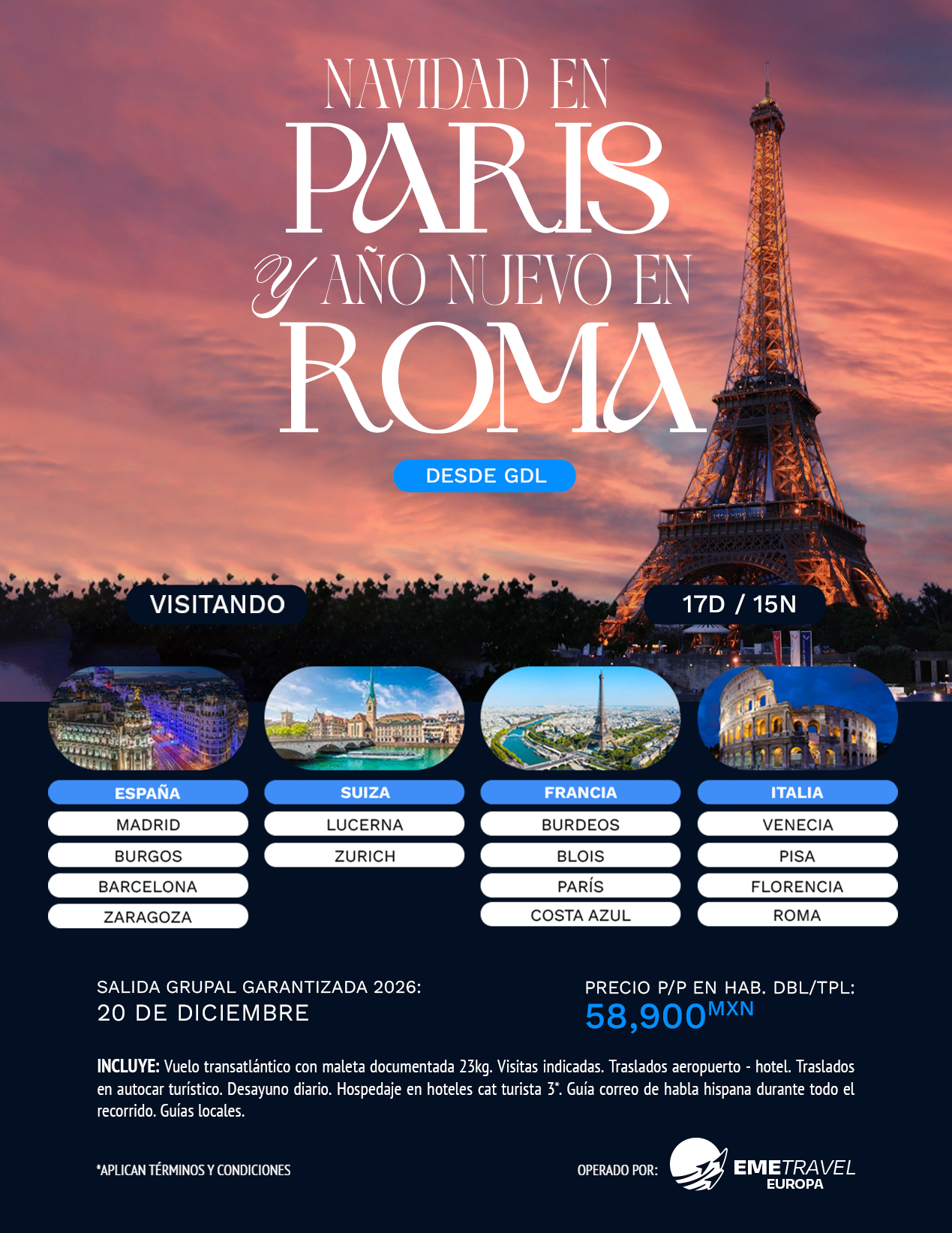 En Roma, se asistirá a la audiencia papal y se explorará la Ciudad Imperial, incluyendo el Coliseo y la Plaza de San Pedro. El viaje finaliza con visitas a Pisa, Niza y Barcelona, recorriendo sus sitios más representativos antes de regresar a Madrid y tomar el vuelo de regreso a México.