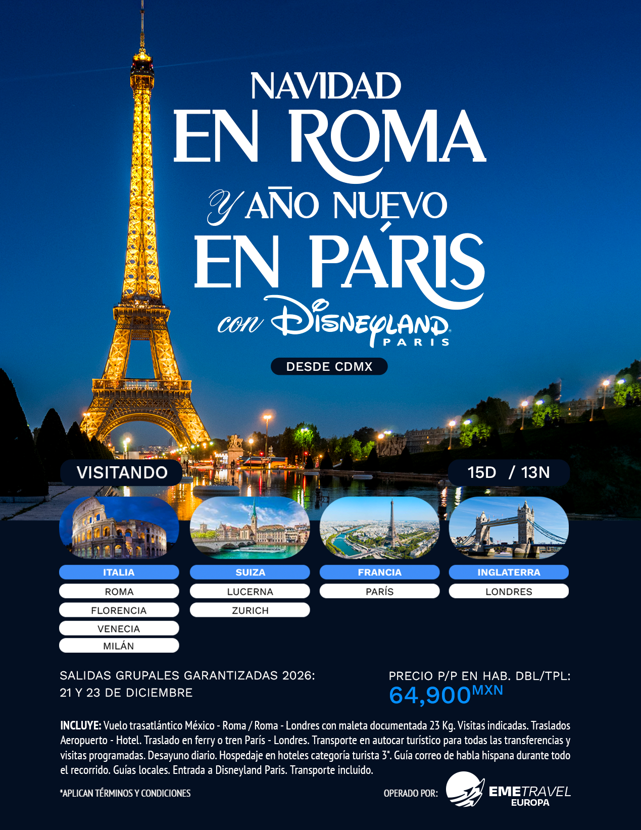 Europa clásica con un toque de magia. Recorre Italia (Roma, Florencia, Venecia y Milán), Suiza (Lucerna y Zúrich), Francia (París) e Inglaterra (Londres). Disfruta panorámicas y tiempo libre para callejear, probar sabores locales y fotografiar iconos. La cereza del pastel: entrada a Disneyland París para vivir un día de fantasía entre castillos, desfiles y atracciones.