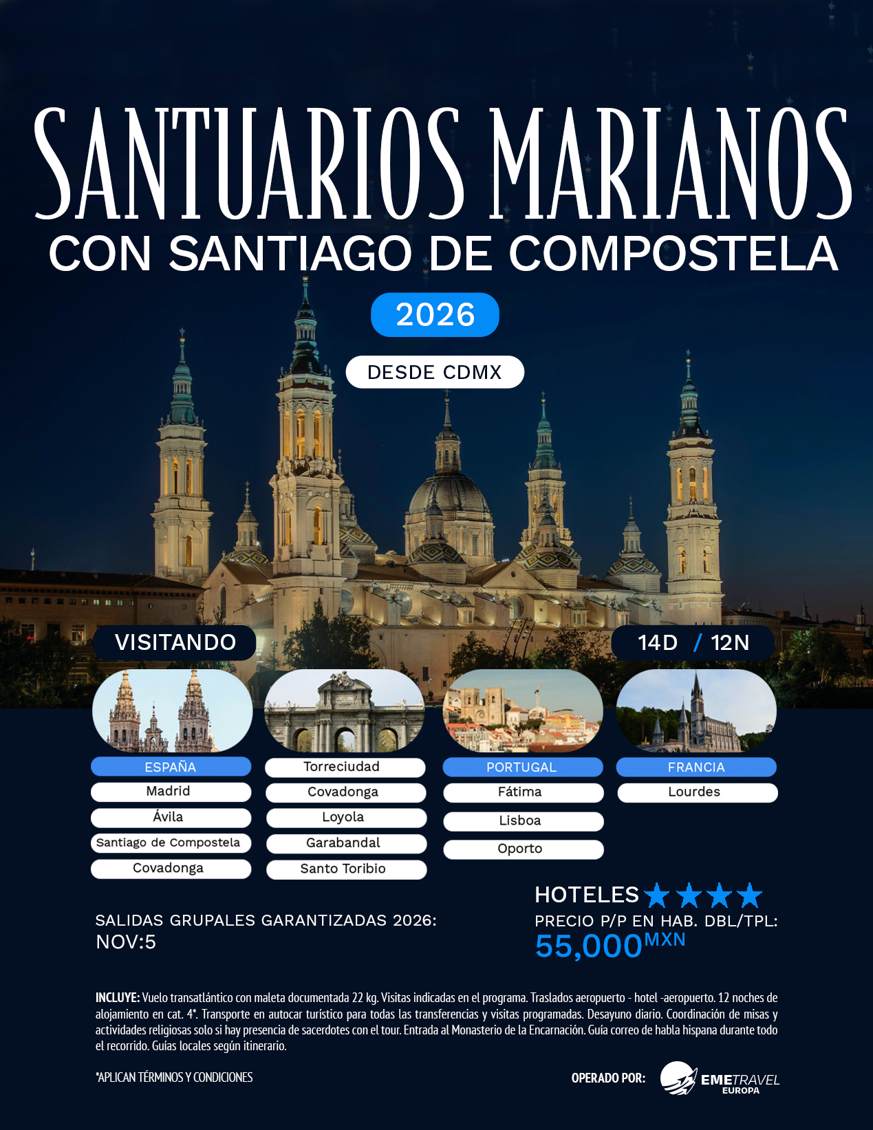 Desde Madrid, el viaje sigue por Ávila —tierra de Santa Teresa— hacia Fátima, corazón de devoción mariana, con visita a Valinhos, la Capelinha y las casas de los pastorcitos. Lisboa y Oporto añaden historia y encanto antes de llegar a Santiago de Compostela, donde la Misa del Peregrino y la tumba del Apóstol marcan el espíritu del camino. El recorrido continúa por Covadonga, Santander y Santo Toribio, pasa por Garabandal y Loyola, y culmina en Lourdes, con tiempo para orar en la Gruta y unirse a la Procesión de las Antorchas. El regreso por Torreciudad y Zaragoza —ante la Virgen del Pilar— cierra una ruta de fe, arte y paisajes inolvidables.