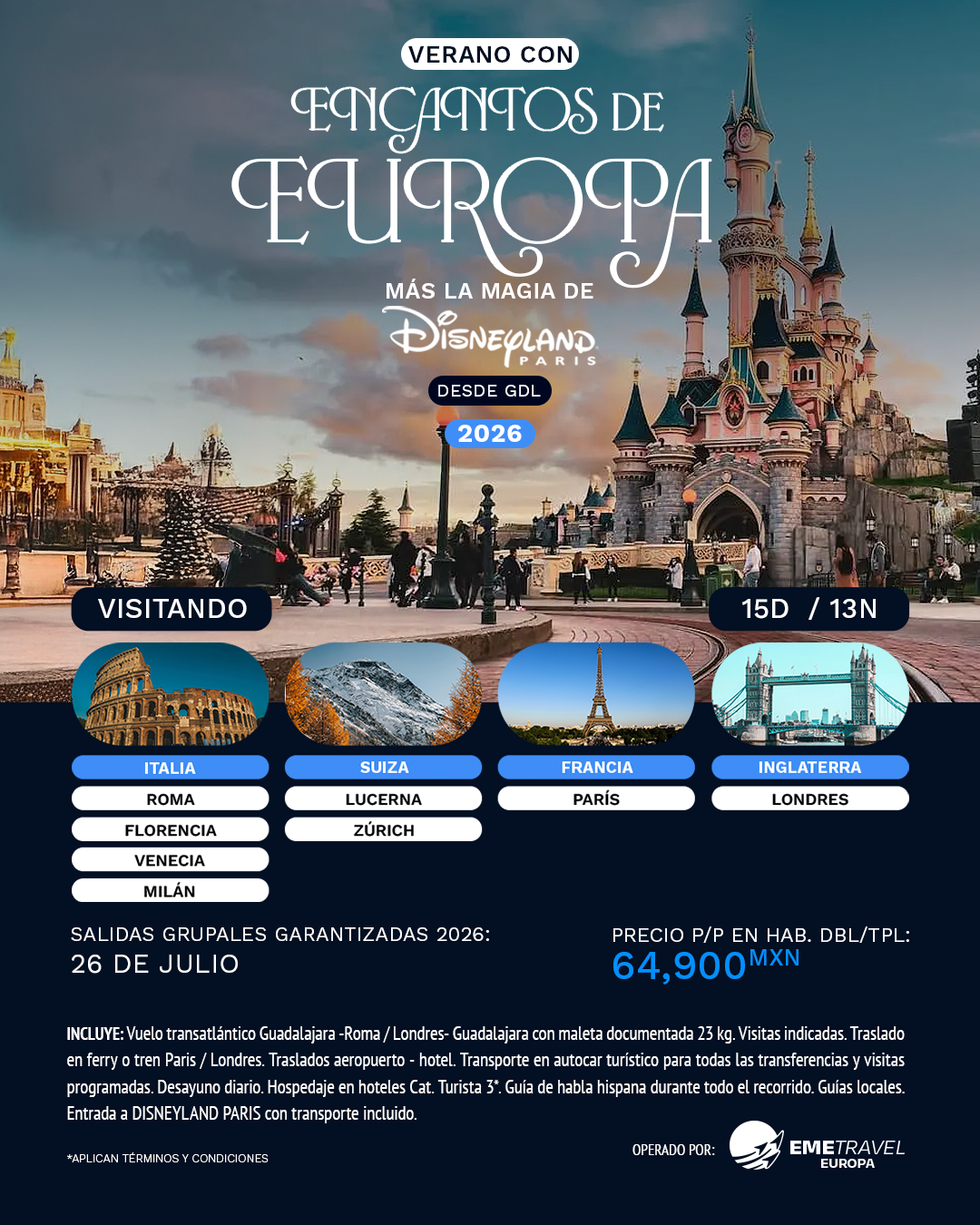 Europa clásica con un toque de magia. Recorre Italia (Roma, Florencia, Venecia y Milán), Suiza (Lucerna y Zúrich), Francia (París) e Inglaterra (Londres). Disfruta panorámicas y tiempo libre para callejear, probar sabores locales y fotografiar iconos. La cereza del pastel: entrada a Disneyland París para vivir un día de fantasía entre castillos, desfiles y atracciones.