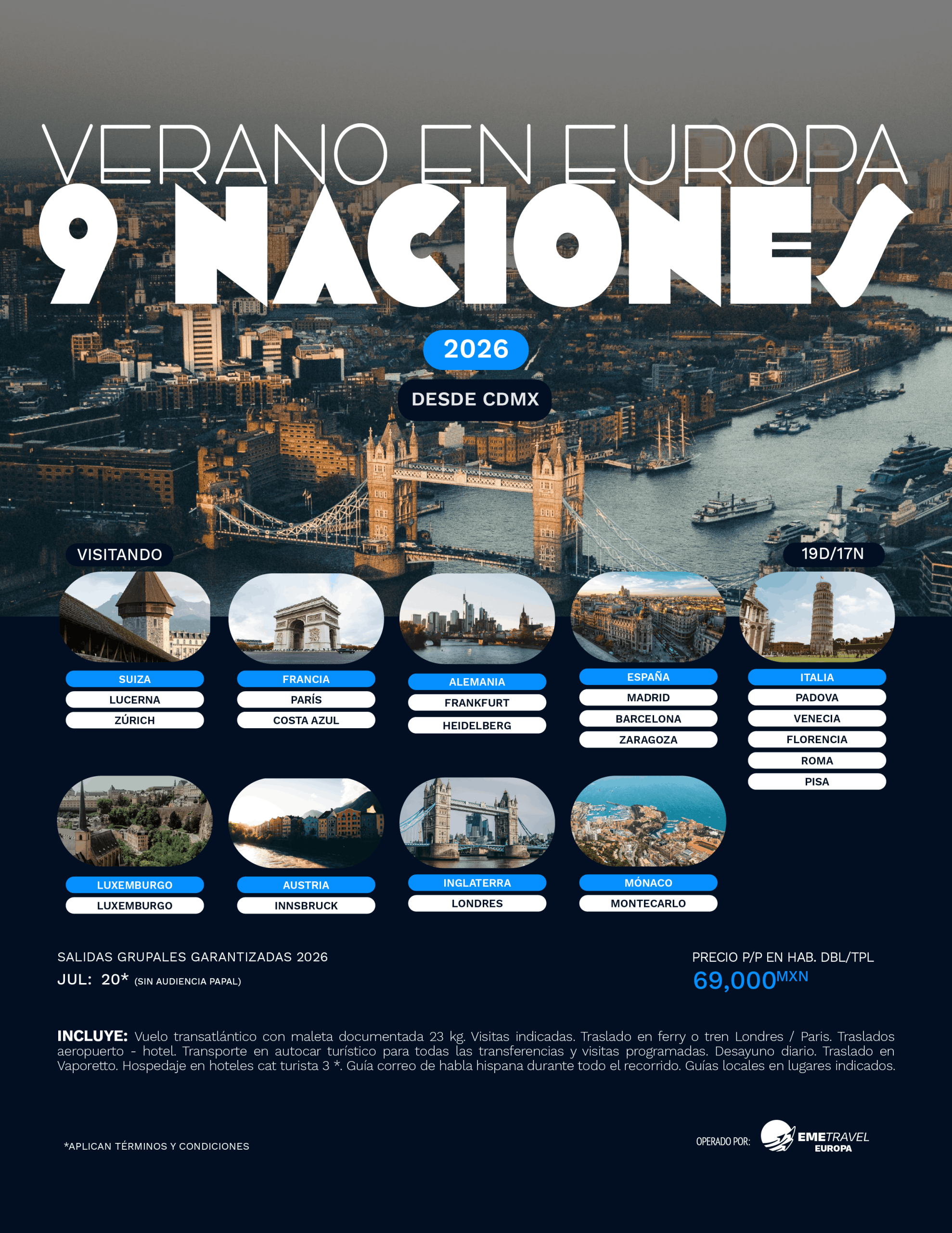 Un viaje fascinante por Europa inicia en la vibrante Londres, con sus icónicos monumentos como el Big Ben y el Palacio de Buckingham. París deslumbra con su elegancia, desde los Campos Elíseos hasta la Torre Eiffel, con la opción de explorar Versalles o la encantadora ciudad de Brujas. La ruta sigue hacia Luxemburgo y Frankfurt, donde la historia y la modernidad se entrelazan. Heidelberg, con su esencia académica, da paso a la sofisticada Zúrich y la pintoresca Lucerna, con la posibilidad de ascender al Monte Titlis. Innsbruck, con sus paisajes alpinos, conduce a la romántica Venecia, donde un paseo en góndola es imprescindible.